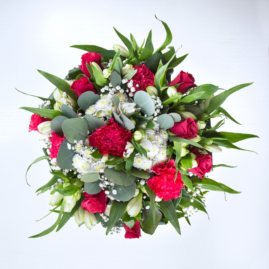 Admire the splendid beauty of our handcrafted bouquet. Featuring vibrant red roses, pure white chrysanthemums, delicate gypsophila, and enriched with white alstroemeria and lush aspidistra foliage for a breathtaking display.