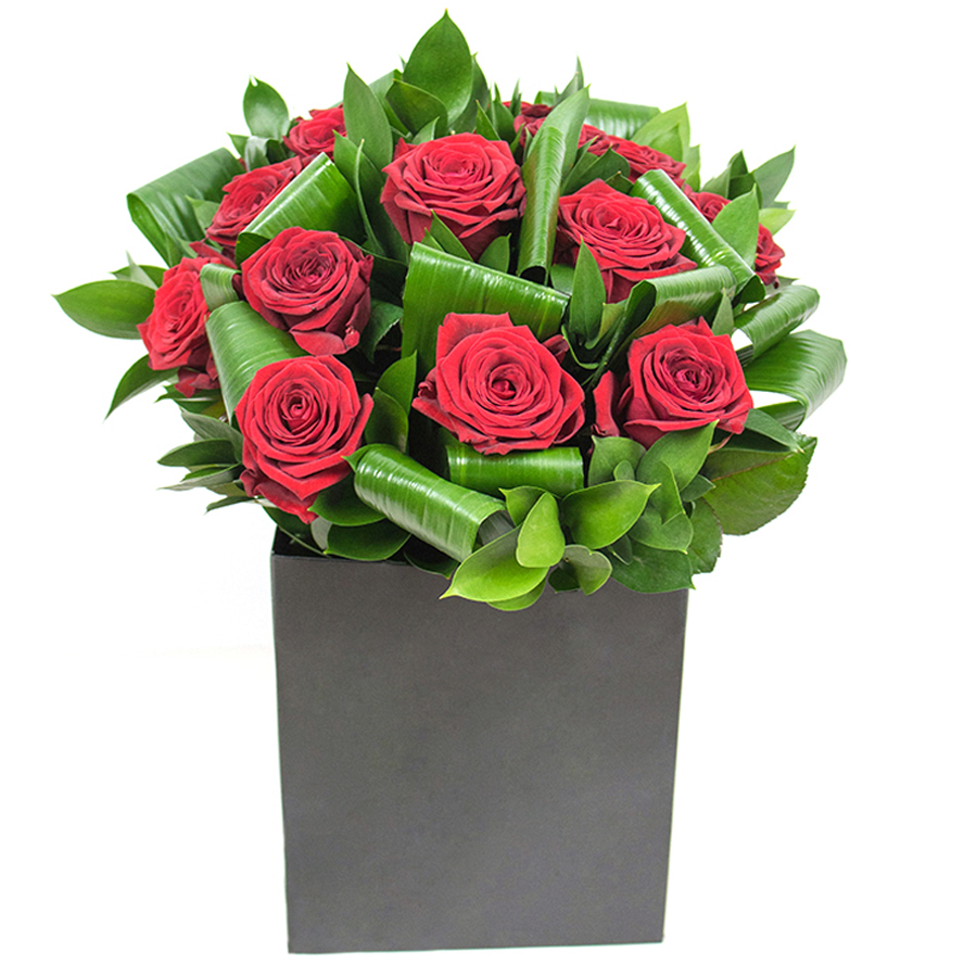 Bring elegance to your space with our beautiful bouquet, featuring vibrant red roses, lush aspidistra leaves, and graceful ruscus. This unique arrangement is designed to enhance any room with its stunning design and vibrant colors.